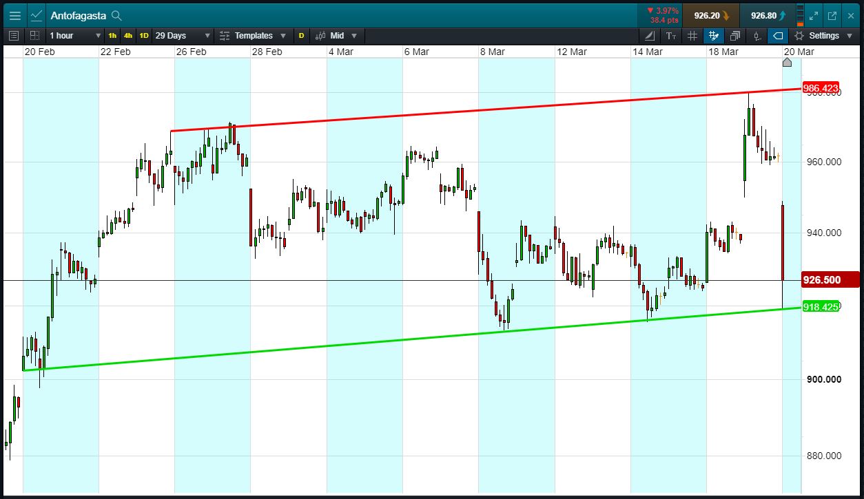Will Antofagasta break support, or will it rise again to recent 985p highs?