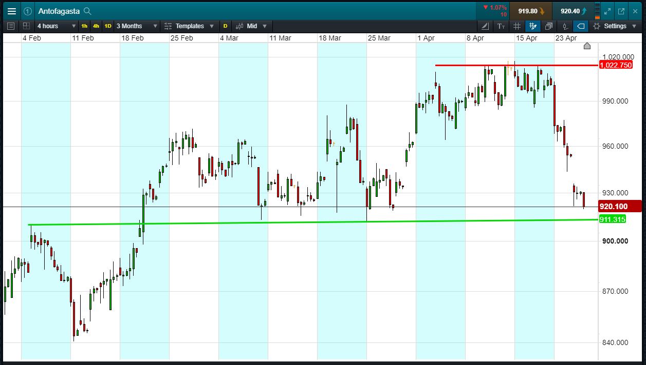 Will Antofagasta break support, or will it rise back to April 1022p highs?