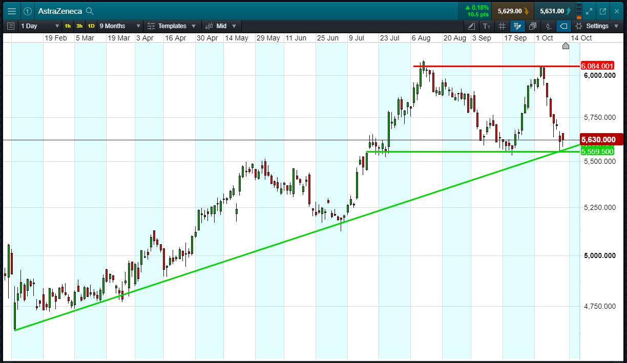 - AstraZeneca has rising support since February; horizontal support since late July