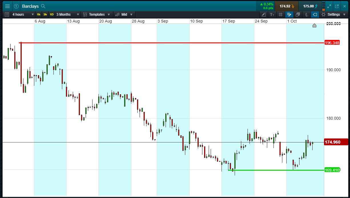 Let’s say you like the range, you think it’s heading back towards 196p again. You decide to buy exposure to £10,000 worth of Barclays using a CFD, at the current price of 175p. To do this, you need £2,000.