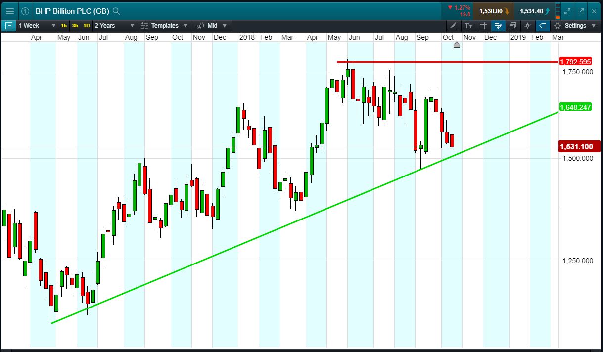 - BHP Billiton has a trendline of rising support since April 2017, recording 4 bounces