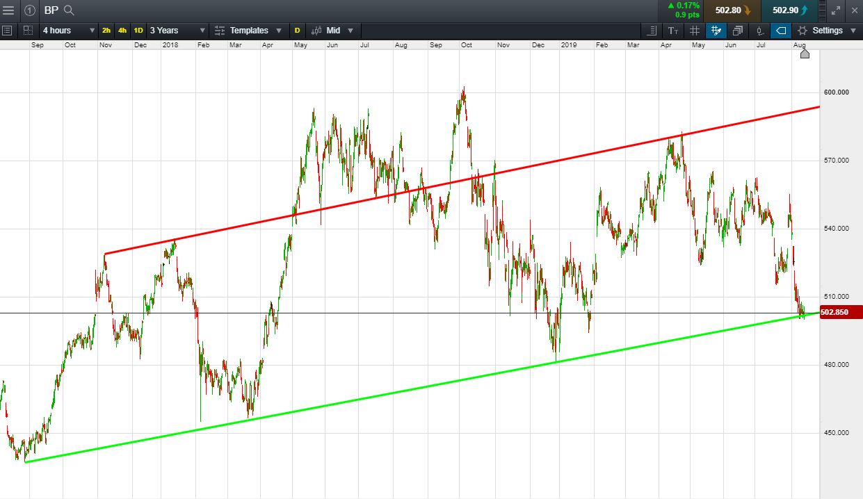 Will BP break 2 year rising support, or will it rise again to July highs of 560p (+11.5%)?