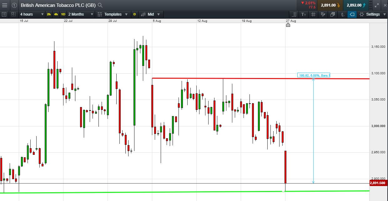 Will British American Tobacco break 2 month support, or will it rise again to recent 3090p highs? (+6.8%)
