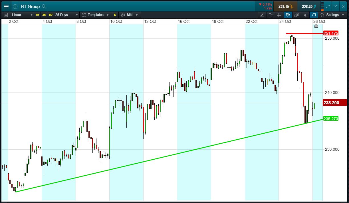 - BT has rising support since the beginning of October, having bounced 3 times, most recently at 234p.
