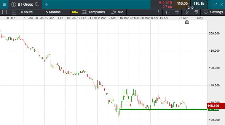 Will BT (BT.A) shares break through support at 112p, or push upwards again to 177p (+36%) February highs?