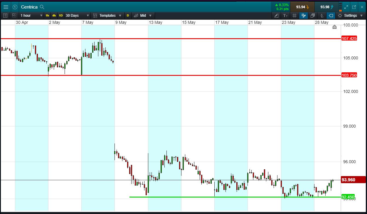 Let’s say you like the Centrica chart and you think the price is heading back to 103p again. You decide to buy exposure to £10,000 worth of Centrica using a CFD, at the current price of 93.9p. To do this, you need £2,000.