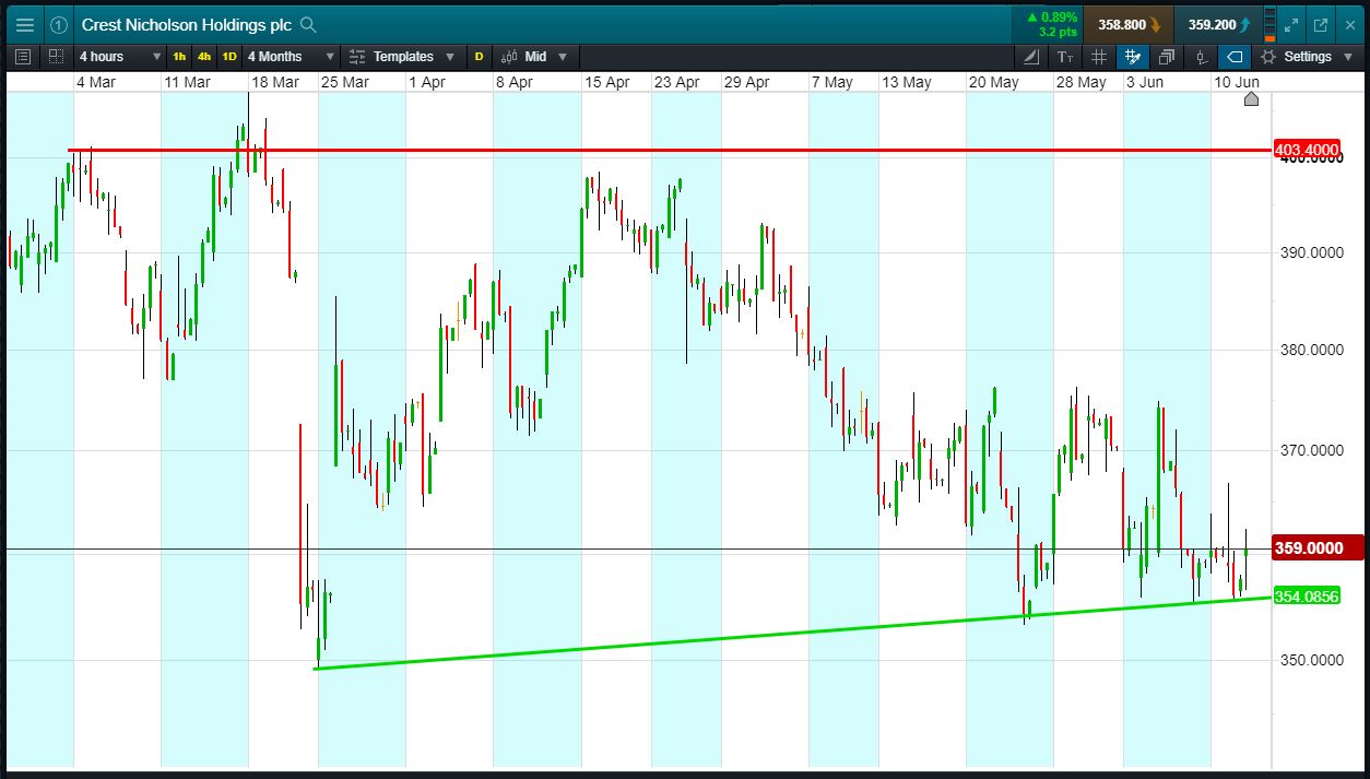 Will Crest Nicholson break support, or will it rise again to 403p highs?