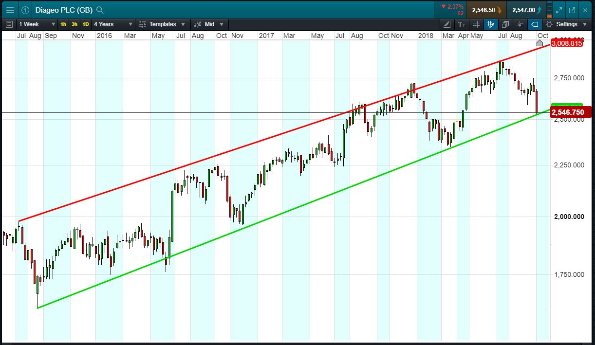 - Bounced off trendline 6 times, most recently today. Now trading 2546p (at time of writing)