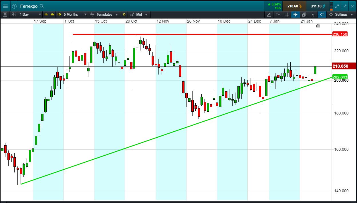 Let’s say you like the Ferrexpo chart and you think the price is heading back towards 236p again. You decide to buy exposure to £10,000 worth of Ferrexpo using a CFD, at the current price of 211p. To do this, you need £2,000.