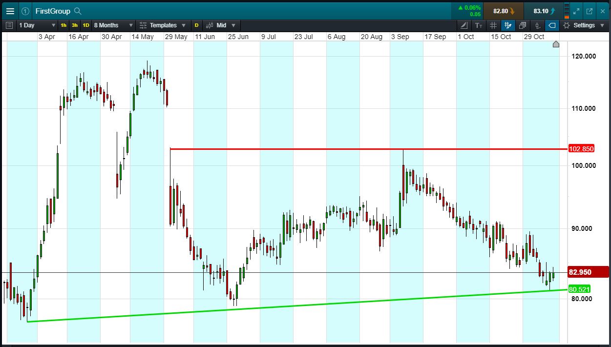 • FirstGroup has rising support since March, with 3 bounces, the most recently at 80.3p,