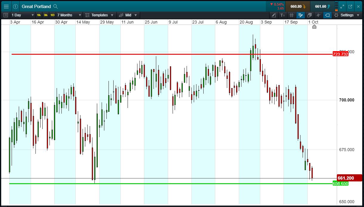 Let’s say you like the range, you think it’s heading back towards 723p again. You decide to buy exposure to £10,000 worth of Great Portland using a CFD, at the current price of 661p. To do this, you need £2,000.