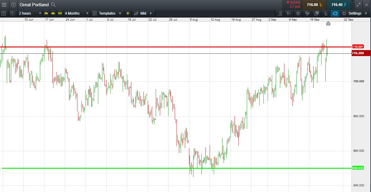 Will Great Portland Estates PLC (GPOR.L) shares move above the current resistance zone around 719p, or will it return to year lows of 649.6p? (-9.4%)?