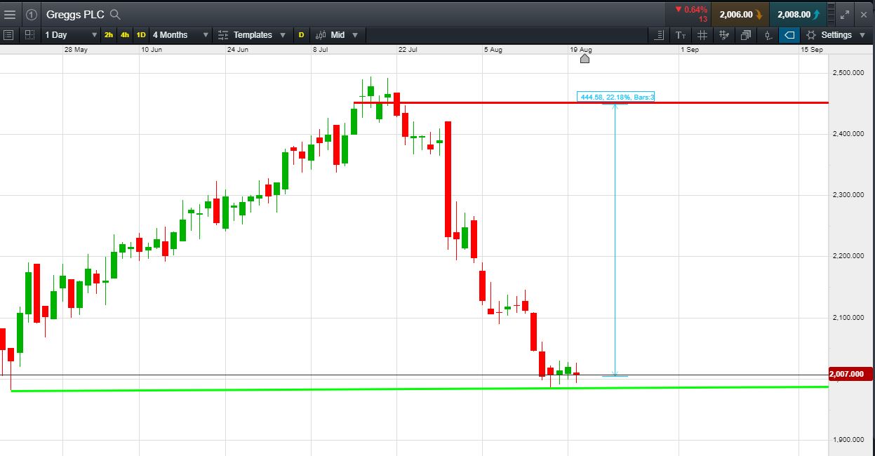- Greggs is trading near 3 month support (dating back to 17th May)