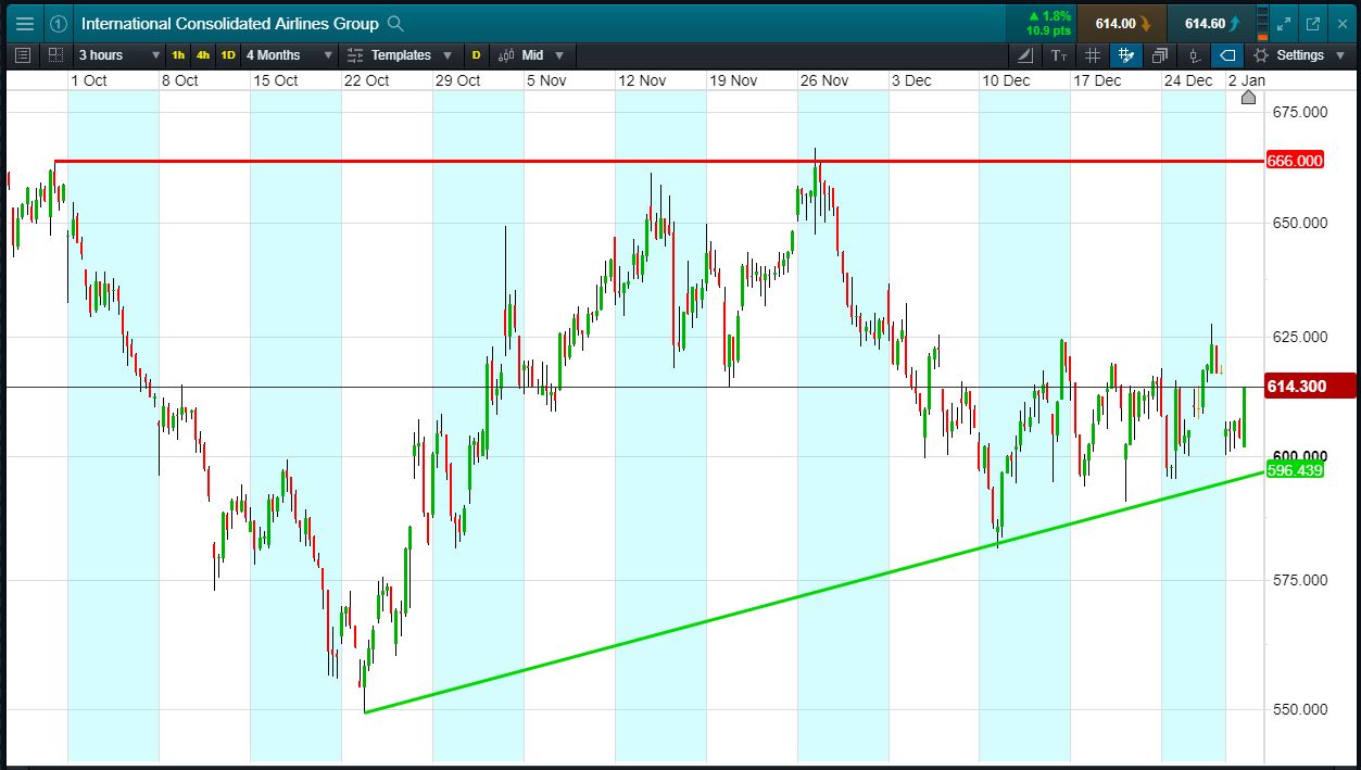 Let’s say you like the range, you think it’s heading back towards 666p again. You decide to buy exposure to £10,000 worth of IAG using a CFD, at the current price of 614p. To do this, you need £2,000.
