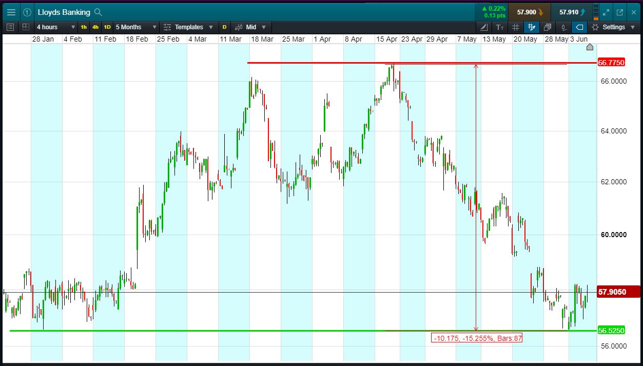 Let’s say you like the Lloyds support, you think it’s heading back up to 66p. You decide to buy exposure to £10,000 worth of Lloyds using a CFD, at the current price of 58p. To do this, you need £2,000.