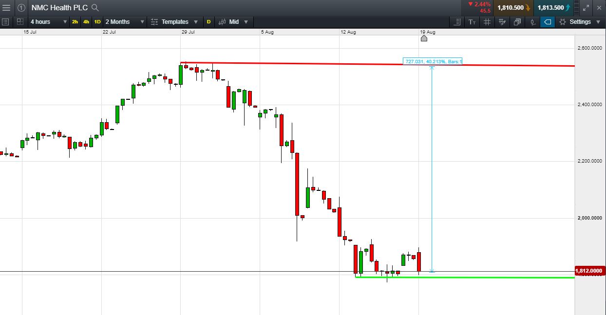 Will NMC Health break support, or will it rise again back to 2550p? (+40.2%)