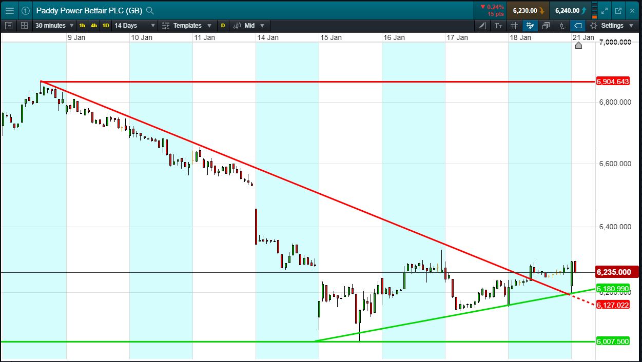 - Paddy Power has rising support at 6180p since last week.