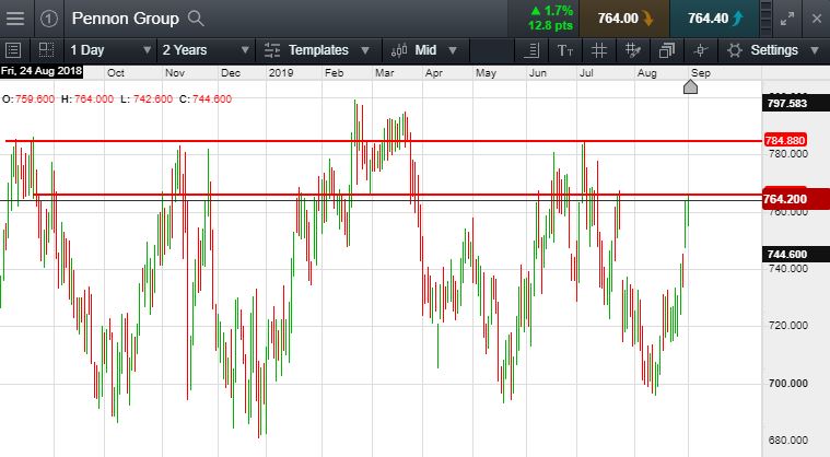 - 3 bounces, most recently in July. Now trading 764p (at time of writing).