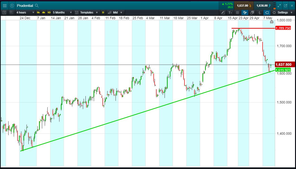 Will Prudential break support, or will it rise back to April 1789p highs?