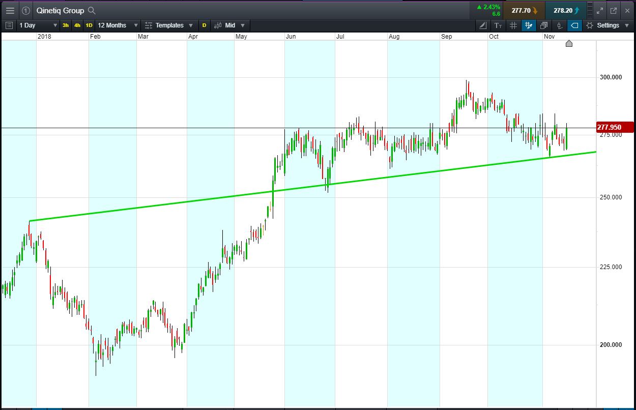 • QinetiQ has a shallow rising support since December 2017, with 3 bounces, most recently last week.