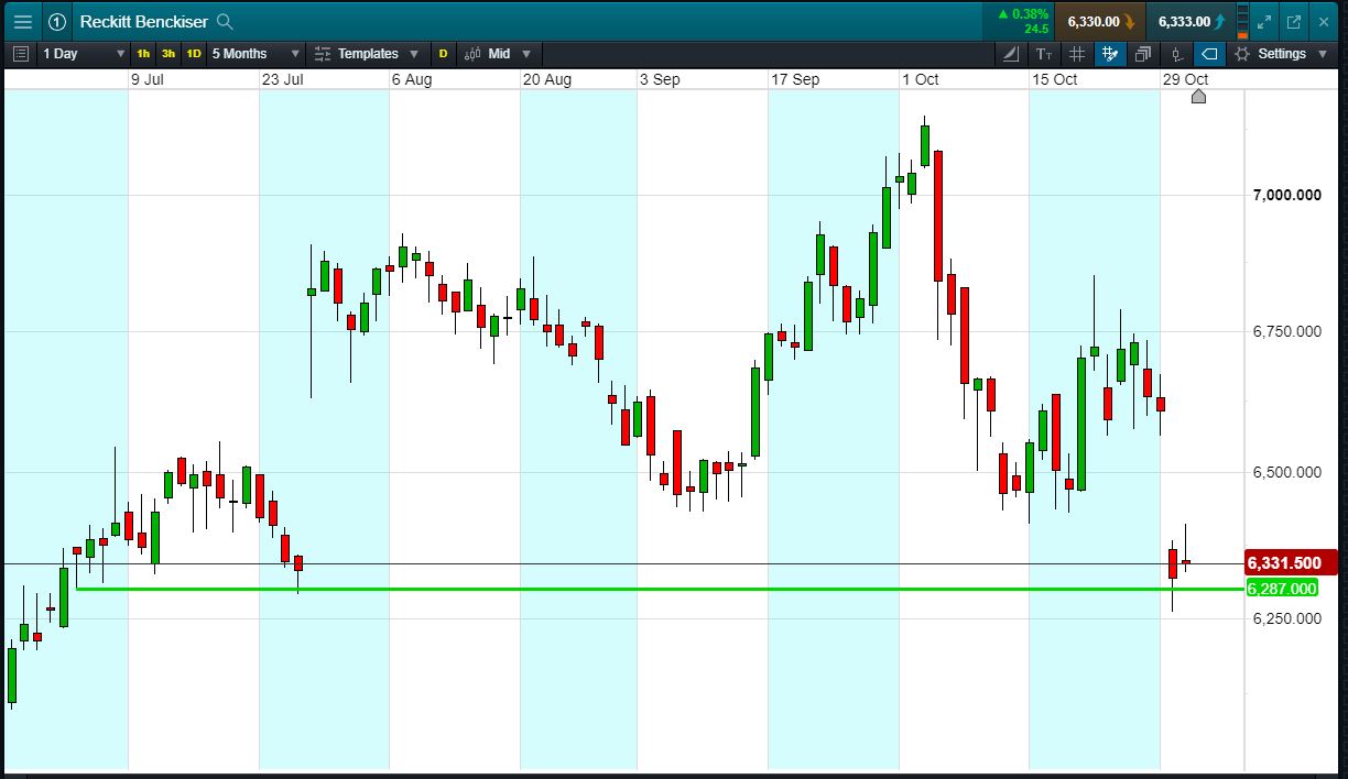 - Reckitt Benckiser has a support level at 6287p since late June, bouncing 4 times, most recently this week.