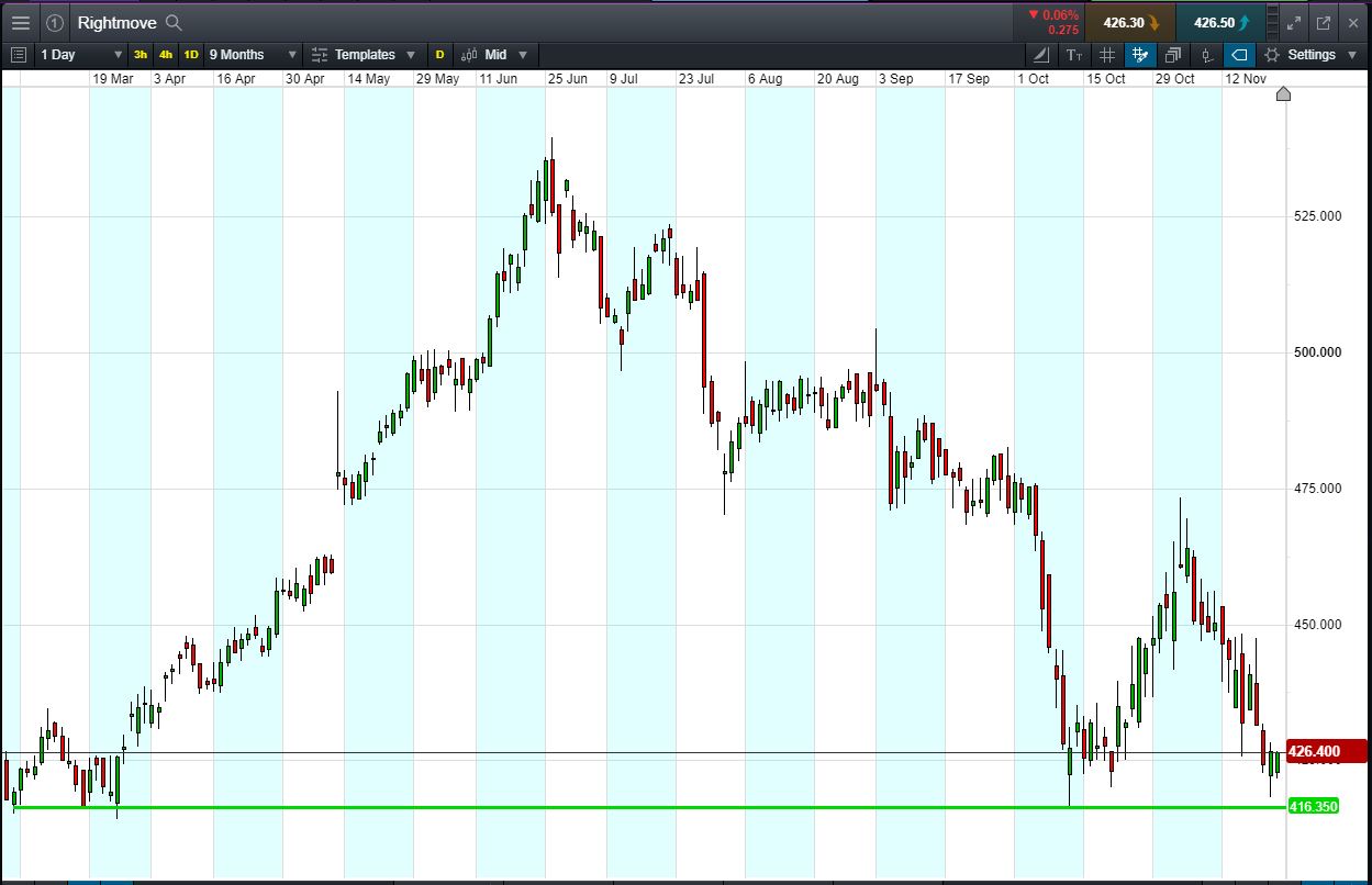 - Rightmove has support around 416p, with 5 bounces since early March.