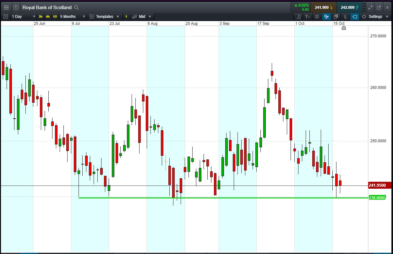- Royal Bank of Scotland has bounced off July support zone around 239p