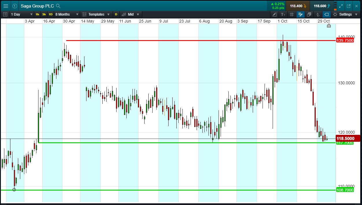 Let’s say you like the Saga chart and you think the price is heading back towards 140p again. You decide to buy exposure to £10,000 worth of Saga using a CFD, at the current price of 118.5p. To do this, you need £2,000.