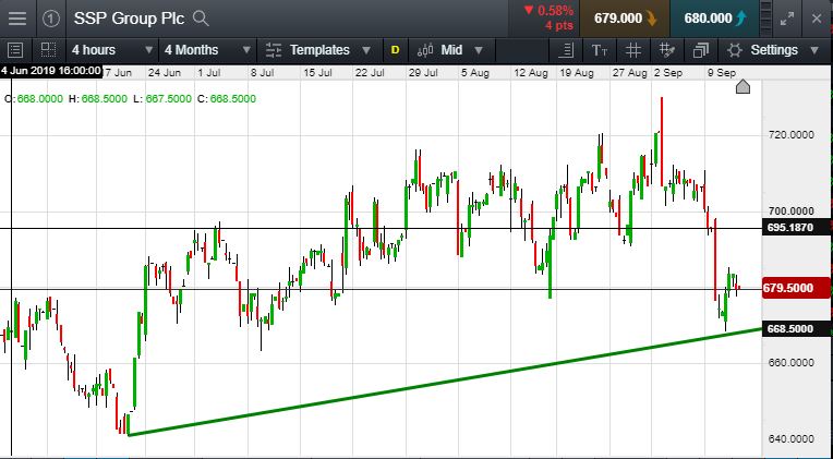 Will SSP Group (SSPG.L) break the 674p-685p support levels, or bounce once more to 721p September highs (+6.3%)?