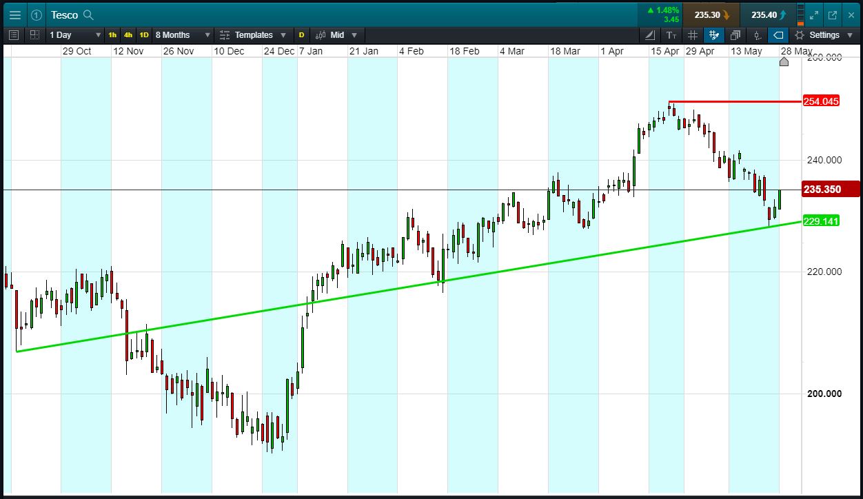 Will Tesco break support, or will it rise again to 254p Apr highs?
