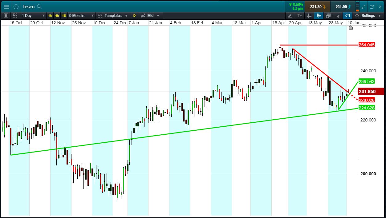 Will Tesco break support, or will it rise again to 254p Apr highs?
