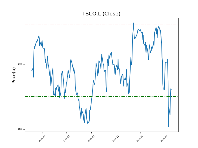 Tesco PLC (TSCO.L): will it break the 225p key support level, or bounce to highs of 258p (+11%)?