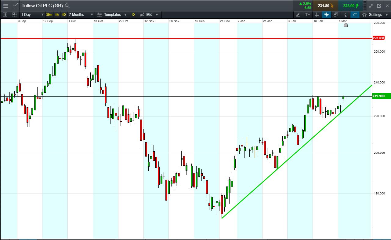 Let’s say you like the Tullow Oil range, you think it’s heading back up to 273p again. You decide to buy exposure to £10,000 worth of Tullow Oil using a CFD, at the current price of 232p. To do this, you need £2,000.