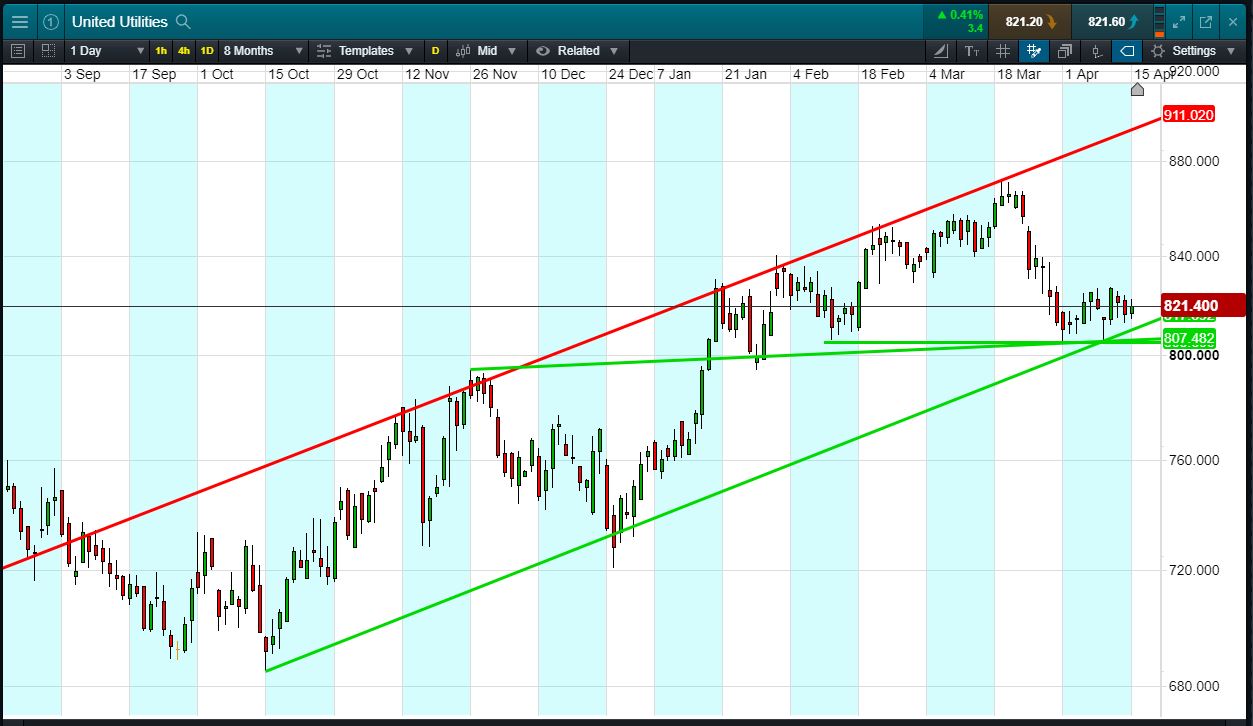 Let’s say you like the United Utilities chart and you think the price is heading back towards 911p again. You decide to buy exposure to £10,000 worth of United Utilities using a CFD, at the current price of 821p. To do this, you need £2,000.
