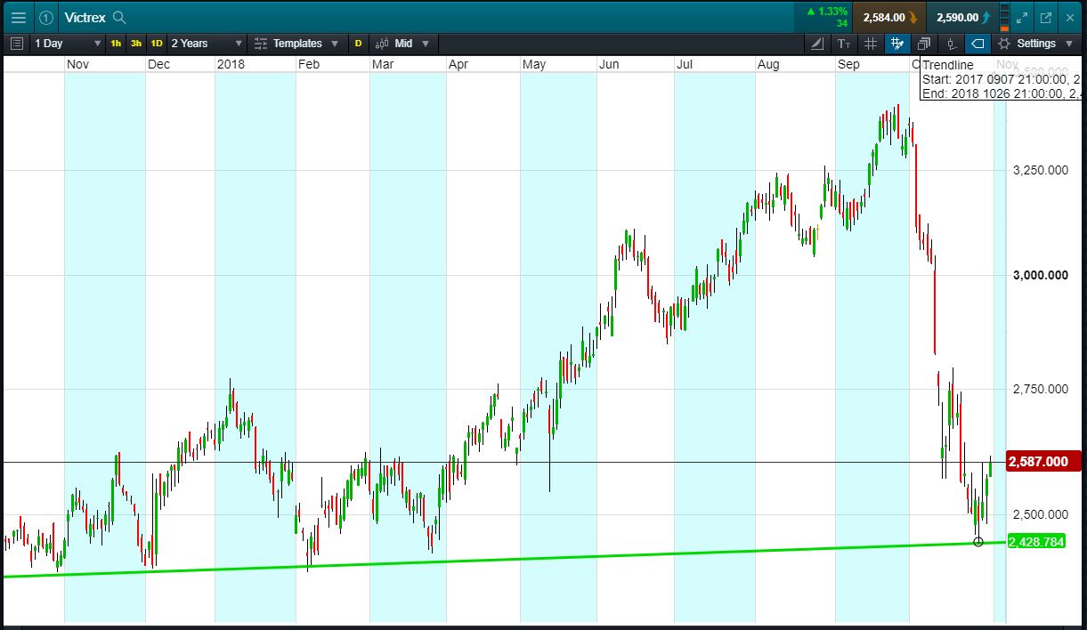 - Victrex has shallow 12-month rising support at 2428p, bouncing 5 times, most recently this week.