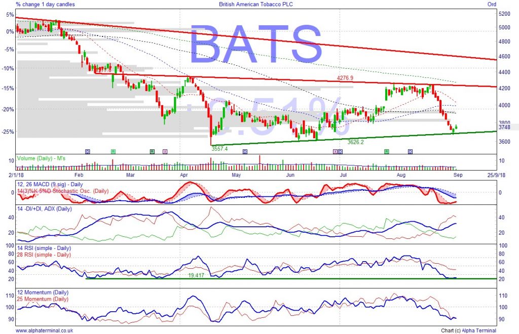 Shares found support after a 13% selloff. The sell-off was derived from a revival of GBP strength, something which has since begun to reverse. The tobacco sector is regarded as non-cyclical and defensive, less sensitive to economic ups and downs. Innovation in e-cigarettes contributing more and more. Attractive 5.8% dividend.