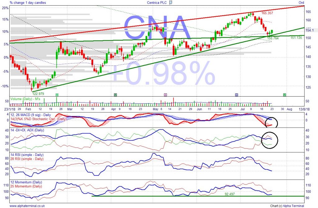 Broker Jefferies (19 July) says SSE profits warning due to hot weather is a potential negative for Centrica. Sector regulation imposing retail price caps are a risk but the group is offsetting these well according to JPMorgan (6 Jun). Good half year results could give the shares a boost next week. Utilities is a defensive sector  sought out in times of market uncertainty.