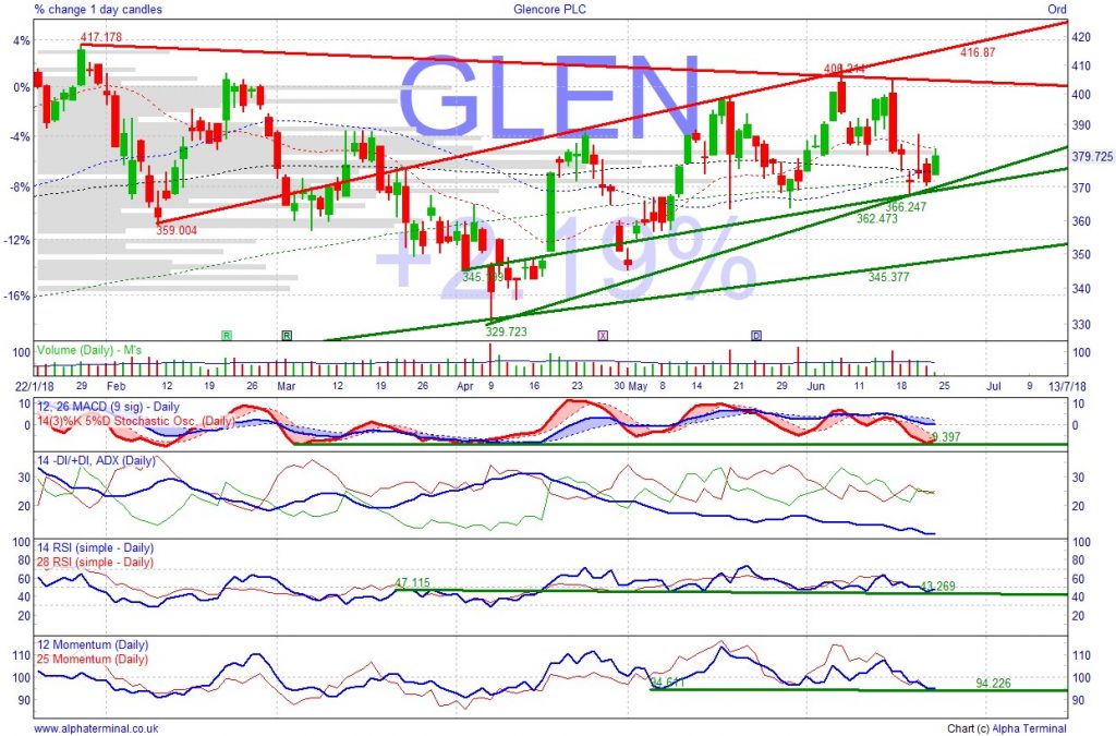 Shares bounced within rising channel, which would see them rally back towards recent highs. Decent 4.2% forecast dividend yield, middle of the road for Mining sector. Despite all the worries about trade wars and economic growth the shares have been quite resilient. The recent settlement of a legal spat in Africa (DRC) removed a cloud regarding Copper output.