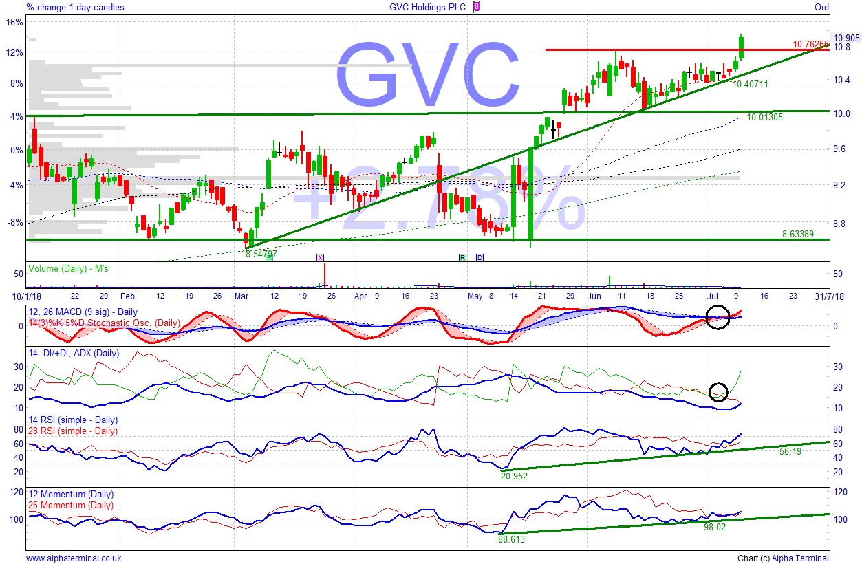 Shares at record highs implies little resistance. Broker Numis (20 Jun) says GVC is its top pick in the sector, even as the UK government raises duty on remote gambling to offset the loss from reduced takes on machine gambling. Broker Berenberg (5 Jun) says GVC is its top pick, upside to its current business before more optionality. 3% div yield. Recently promoted to the UK 100 . Acquired Ladbrokes Coral last year.