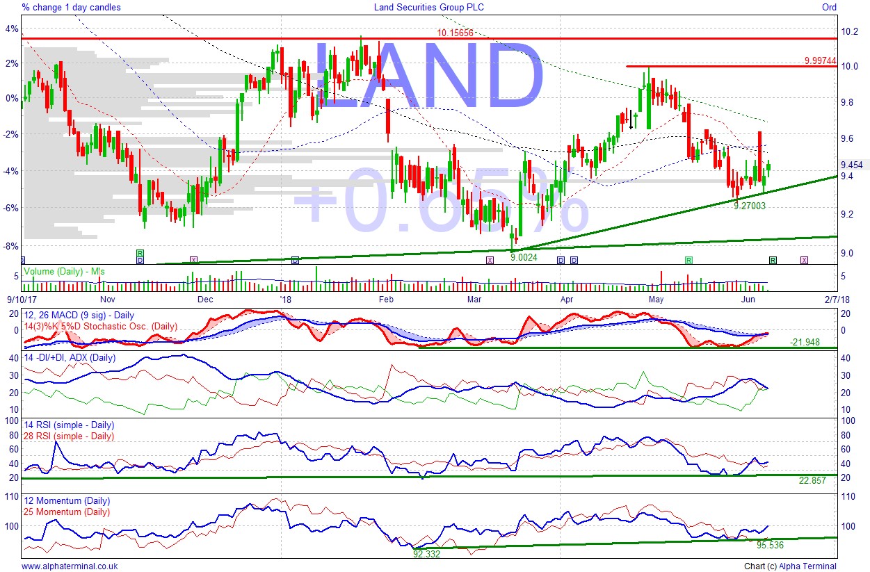 Attractive bullish bounce from rising support. Low UK interest rates, no rate hike imminent. Attractive 5% dividend yield (2017 final div +25%). Whilst UK Retail is not in a great place, due to on-line competition, exposure to office (West End) and leisure helps balance this, along with more prime retail, and long-term leases.