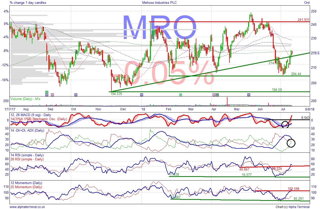 Bullish breakout above rising support dating back to December 2017. Trading within a range in 2018 and currently on a leg up. Healthy dividend yield of 4.4%. Global trade confrontation could hurt businesses, rendering them cheaper and providing Melrose with more bargain opportunities.