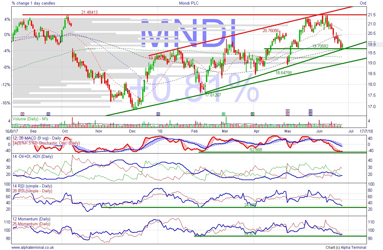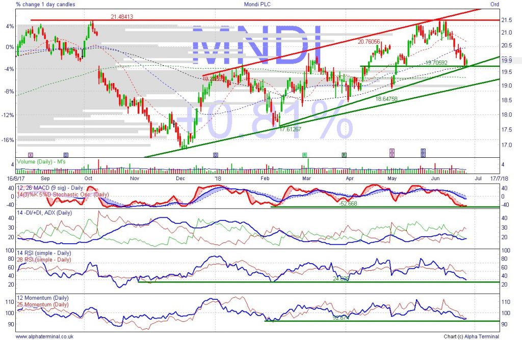Shares found support after recent 8.3% sell-off. Potential for rebound to extend the current rising channel. Beneficiary of need for packaging to protect all manner of industrial and consumer goods, supported by explosion in on-line retail. Growing via small acquisitions. In mid-May, broker Davy said Mondi’s Q1 trading update was strong with good demand and positive pricing momentum. There has been sector M&A recently.