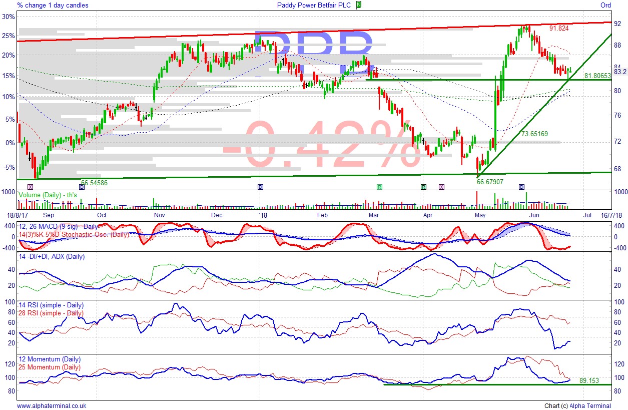 Shares found support after recent sell-off. Positive changes to US regulation on sports betting could represent big growth, especially after merging with US operator FanDuel. A lower than expected Australian point-of-consumption tax could benefit revenues. A busy summer of sport (World Cup, Wimbledon, Ryder Cup) should boost business. Consolidation in gambling sector always a possibility (GVC bough Ladbrokes Coral).