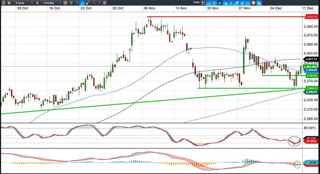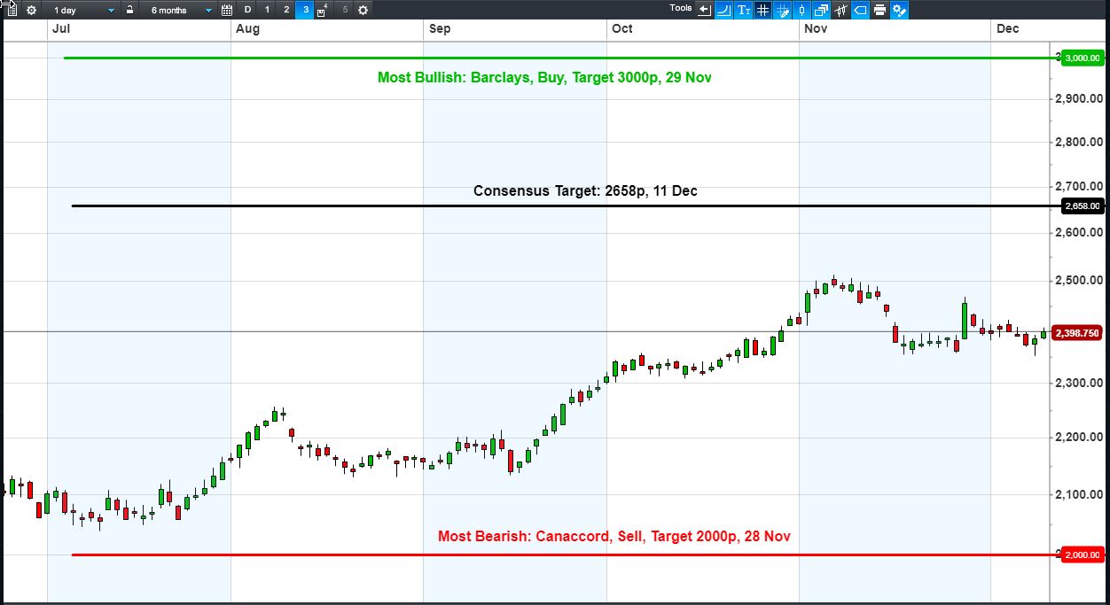 Consensus is 82% bullish on the shares, with the same percentage of analysts suggesting upside potential for the shares from current levels. The consensus target of 2658p is well above our short-term trade objective of 2513p Nov highs. Note the average of December broker updates suggesting even more upside (2723p).