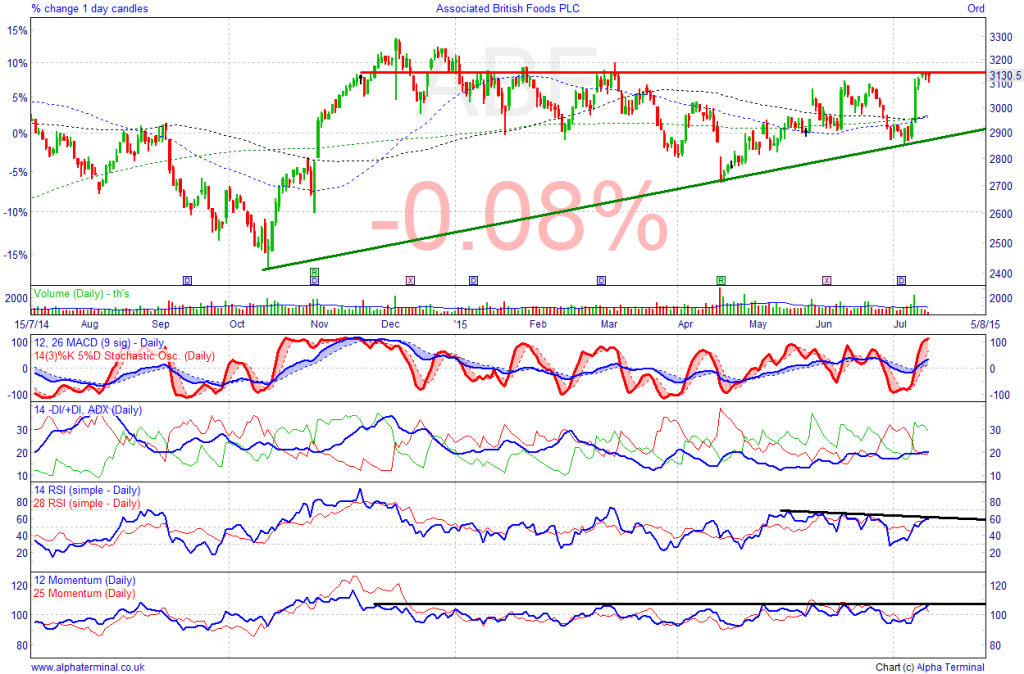 While the long term uptrend is intact, we expect a short term re-tracement to support at rising lows, driven by uncertainty regarding potential currency effects (weaker Euro, stronger Dollar) on profits as ABF rolls out plans to open Primark stores abroad.