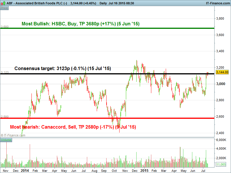 13 July, Barclays, overweight, TP 3000p; 9 Jul, Credit Suisse, Outperform, 3250p; JPMorgan, Overweight, TP 3400p; Jefferies, Hold, TP 2850p; Bernstein, Market Perform, TP 2800p; Canaccord, Sell, TP 2580p; Nomura, Neutral, TP 2815p; Numis, Reduce, TP 2598p; Panmure Gordon, Sell, TP 2630p; Exane BNP, Outperform, TP 3500; Liberum, Buy, TP 3340p; 6 Jul, Goldman sachs, Buy/Cautious, TP 3150p.