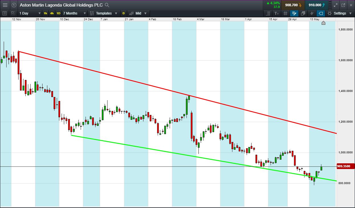 Let’s say you think that Aston Martin shares have upside potential as result of this broker upgrade. You decide to buy exposure to £10,000 worth of Aston Martin using a CFD, at the current price of 909p. To do this, you need £2,000.