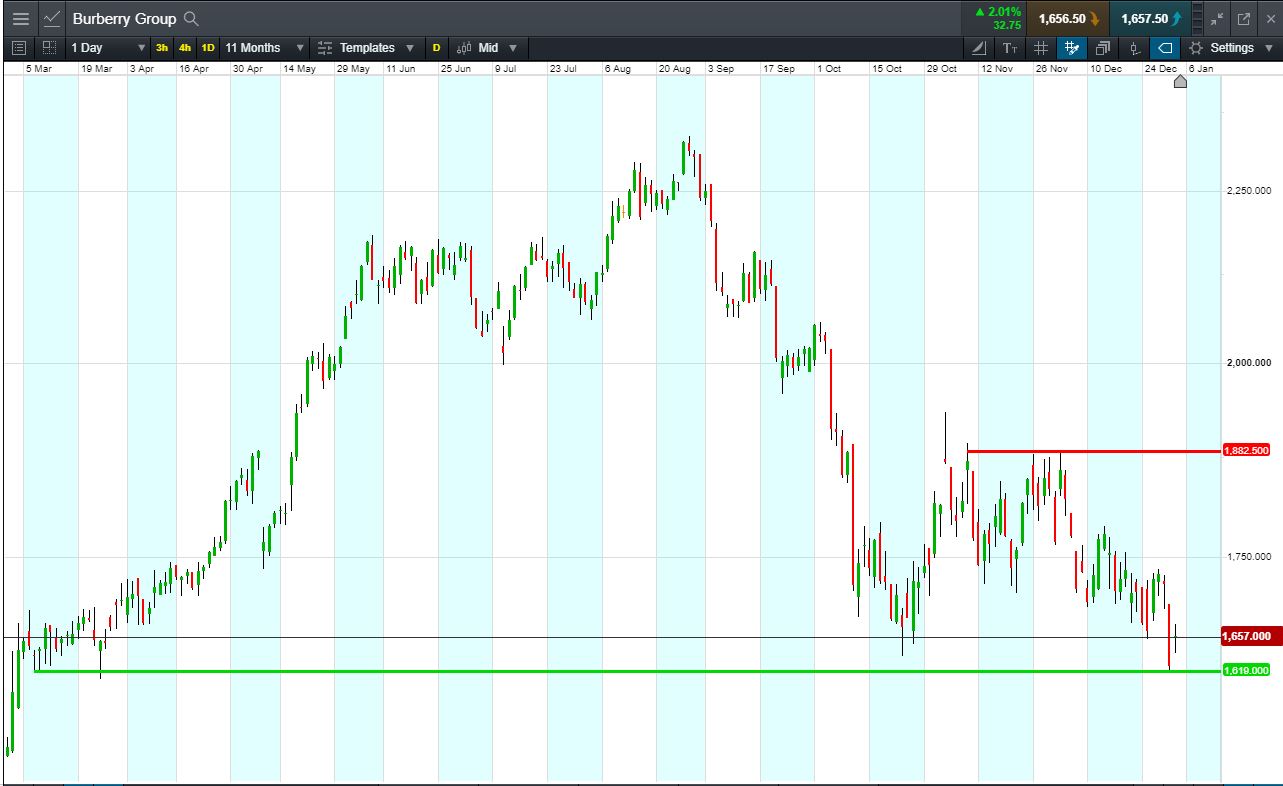 Let’s say you think that Burberry shares have upside potential as result of this broker upgrade. You decide to buy exposure to £10,000 worth of Burberry using a CFD, at the current price of 1657p. To do this, you need £2,000.