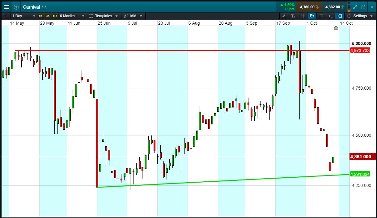 Let’s say you think that Carnival shares have upside potential as result of this broker upgrade. You decide to buy exposure to £10,000 worth of Carnival using a CFD, at the current price of 4381p. To do this, you need £2,000.