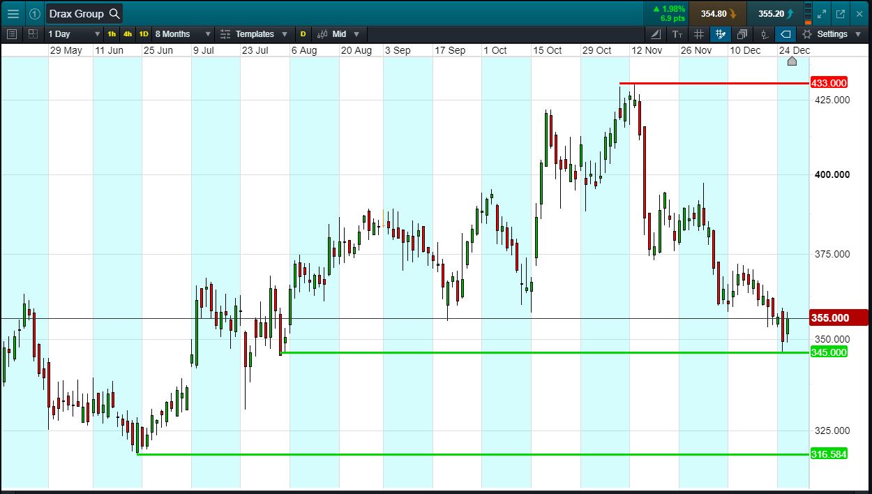 For the purpose of this example, let’s assume the Drax share price rises to 433p Oct/Nov highs (+22.0%). Your profit would be £2200 from your initial investment of £2,000.